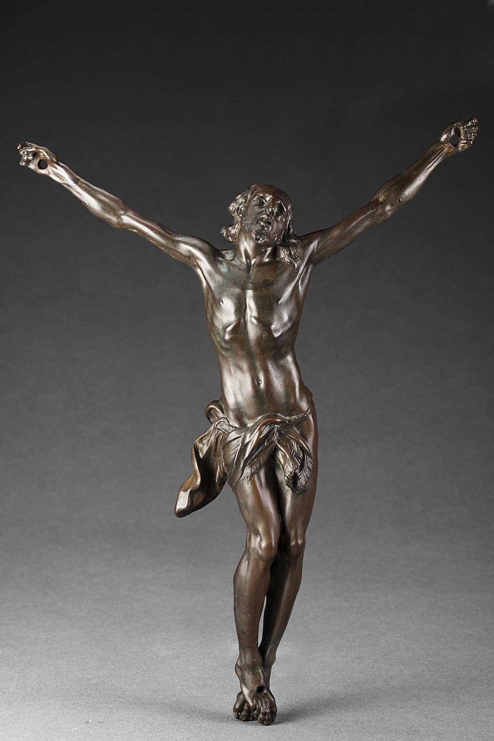 Artista dell'inizio del sec. XVIII "Cristo crocifisso" scultura in bronzo brunito (cm 24) Early 18th-century artist "Christ on the cross" bronze sculpture
