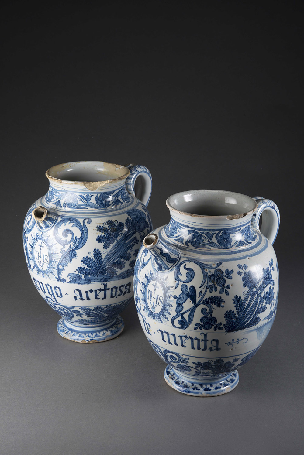 Coppia di versatoi farmaceutici in maiolica monocroma blu su smalto bianco. Decoro ‘calligrafico’ e, sotto al beccuccio versatore, trigramma ‘IHS’ in medaglione a sole raggiato appartenente ad una farmacia conventuale. Sotto al piede marca di fabbrica in blu: stemma di Torino con corona. Torino, metà del sec. XVII (cm 22.5)(difetti e restauri) La manifattura torinese del Regio Parco, per volere e concessione del Duca Carlo Emanuele II, comincia la sua attività dal 1649. A gestire la fabbrica vennero chiamate maestranze liguri (Gian Giacomo Bianchi di Genova e Nicolò Conrado di Albisola), per questo le caratteristiche della maioliche liguri e torinesi di questo periodo sono molto simili per decoro e stile. Pair of mid-17th century majolica pharmacy jugs (defects and restorations)