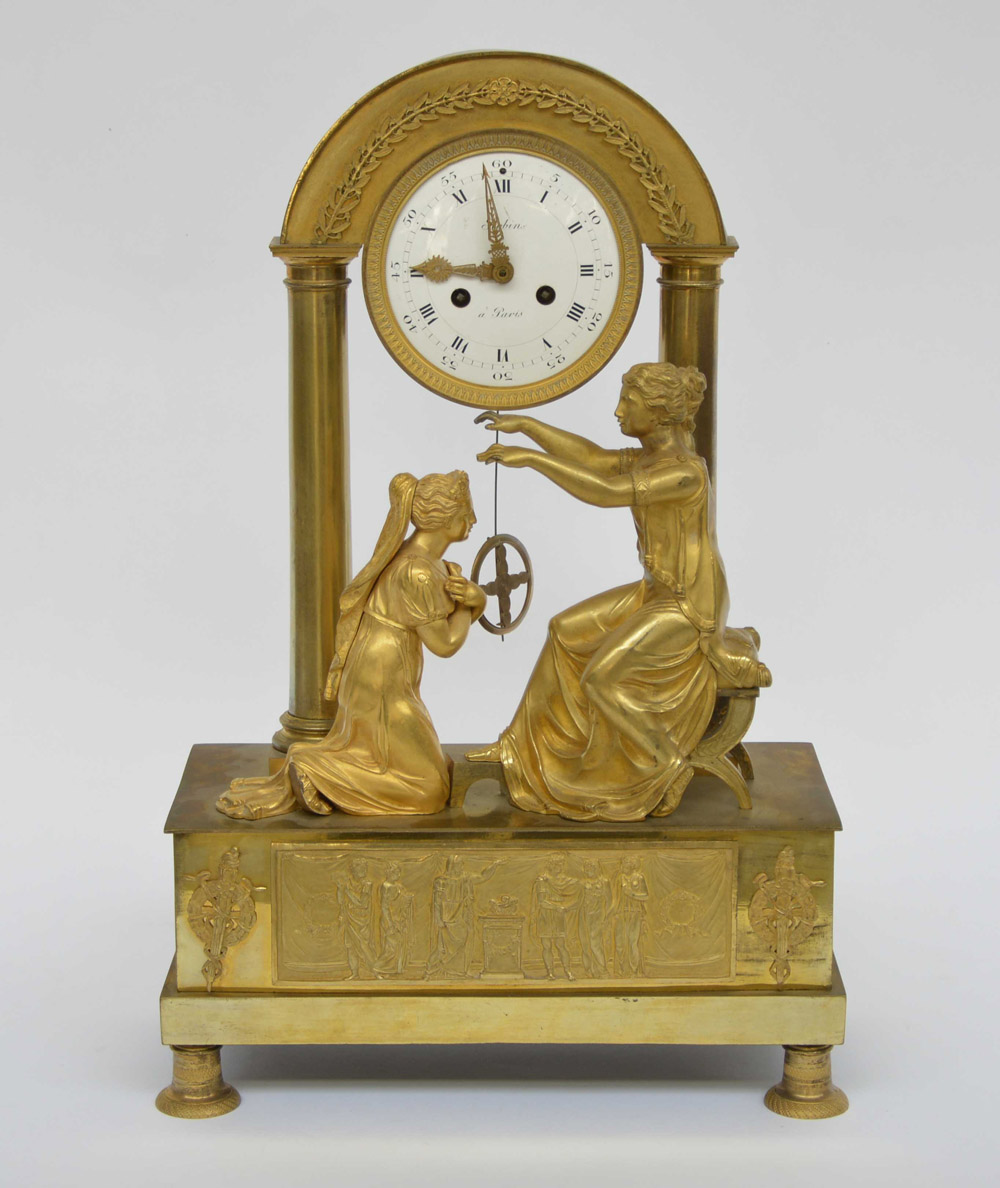 Pendola da tavolo in bronzo dorato, base decorata da placche cesellate a scene classiche e fregi dorati sormontati da due figure femminili a tutto tondo. Quadrante smaltato a numeri arabi e romani firmato 'Robin a Paris' sorretto da colonne a tutto tondo. Francia, 1820 circa (difetti) French gilt bronze table clock (defects)