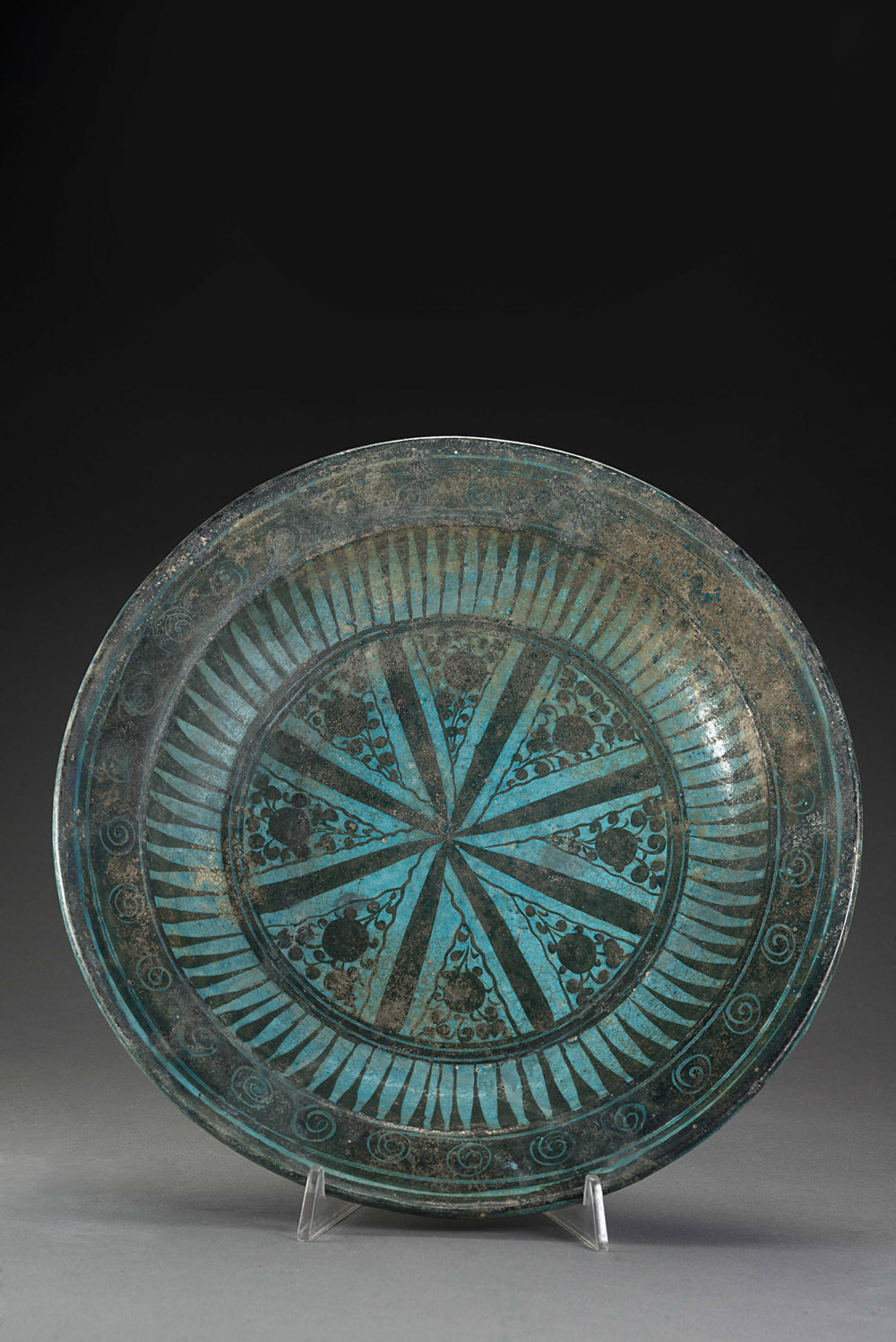 Manifattura persiana antico piatto in terracotta smaltata a motivi geometrici e floreali su fondo azzurro con tracce di doratura (d cm 31) (difetti) Prov: Hadji Baba, Teheran. Copia della lettera d'acquisto datata 11/01/1977 che lo data XI/XII secolo dopo Cristo Ancient Persian enamelled terracotta dish (defects)
