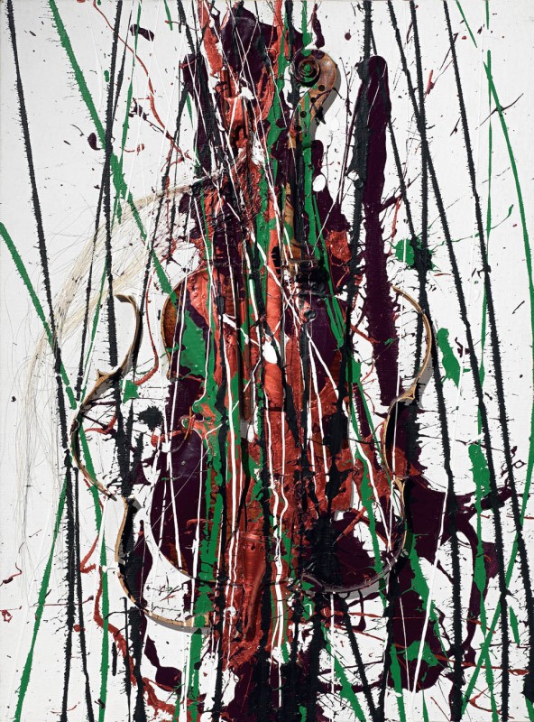 Arman Nizza 1928 - 2005 Senza titolo Acrilico e violino sezionato su tela tesa su tavola, cm. 81x60 Firma in basso sul risvolto della tela: Arman. Certificato con foto firmato dall'artista in data 21/09/2002, con n. 525 e n. 4101.