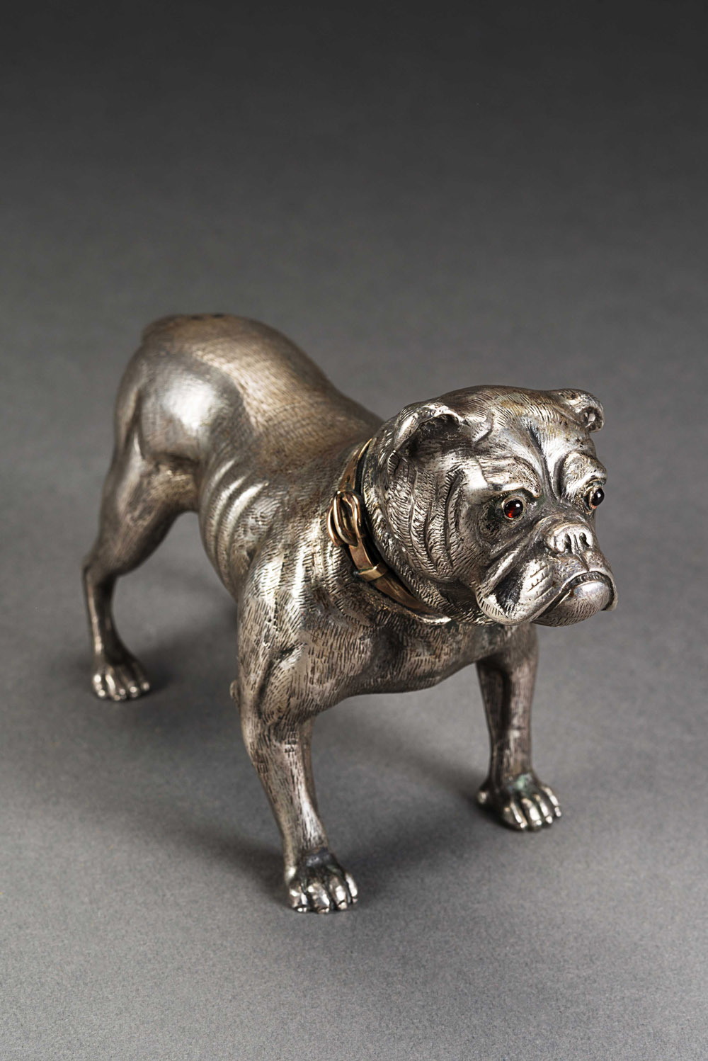 Lotto 886 | Figura in argento raffigurante un bulldog a tutto tondo con collare...