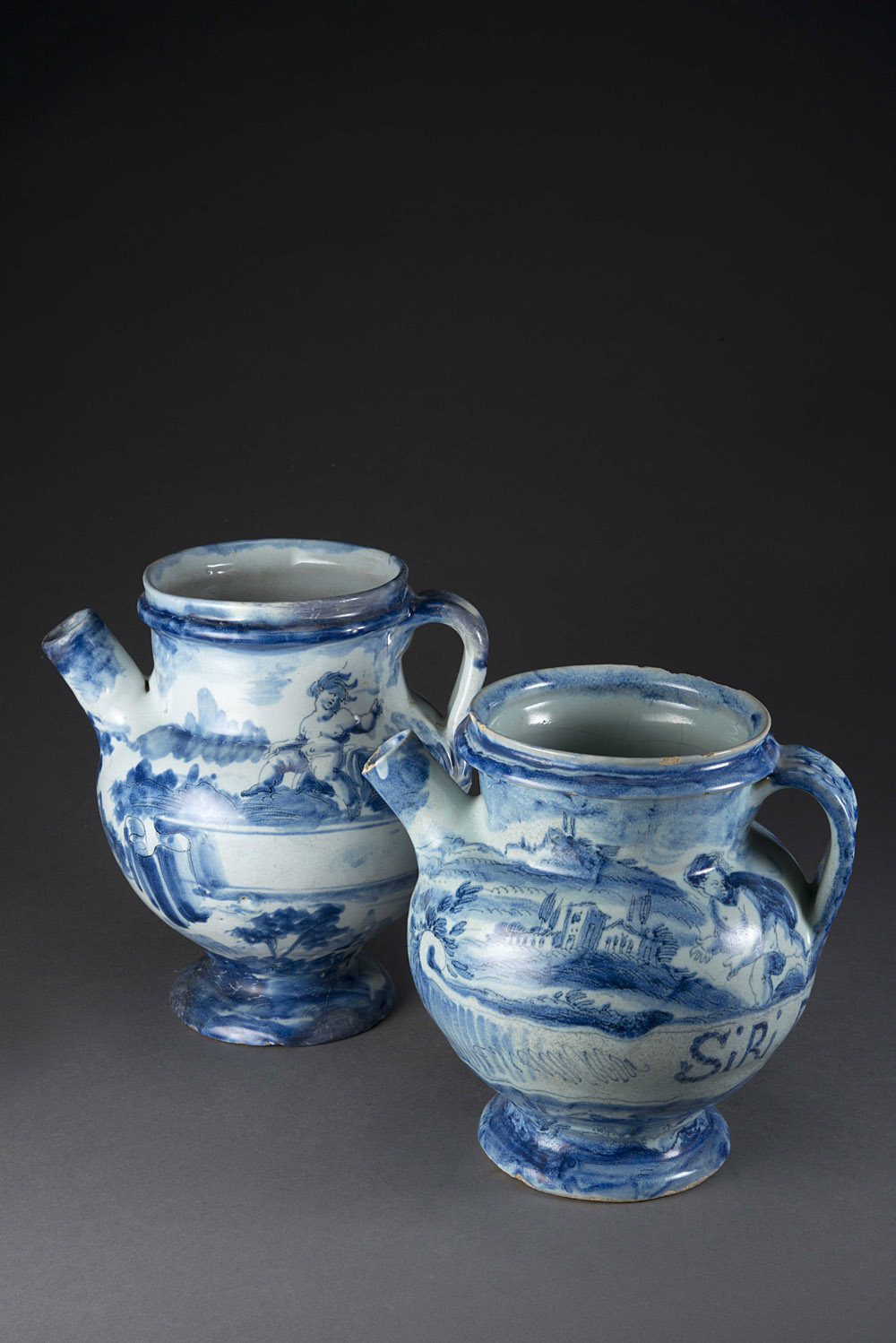 Due versatoi farmaceutici in maiolica di forma simile ma con piede differente decorati ‘a scenografia barocca’ in monocromia blu. Sotto al piede marca di fabbrica : Lanterna. Savona, XVIII secolo (h. cm.19 e h. cm. 21)(difetti e mancanze) Two 18th-century majolica pharmacy jugs (defects and missing parts)