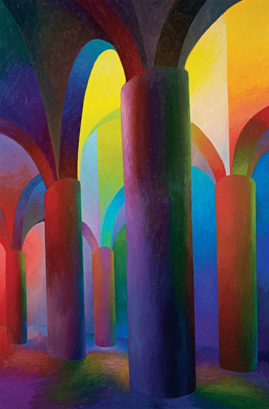 Salvo Leonforte (En) 1947 Interno con funzioni straordinarie, 1990 Olio su tela, cm. 150,5x99,5 Titolo, firma e data al verso sulla tela: "Interno con / funzioni / straordinarie" / Salvo 31.1.90; sul telaio: etichetta parzialmente abrasa Galleria dello Scudo / Verona / Mostra Salvo [...] / 6 dicembre 1992 - 31 gennaio 1993 / Opera esposta. Foto autenticata dall'artista. Esposizioni: Salvo Archeologie del futuro. Opere 1972-1992, Verona, Galleria dello Scudo, 6 dicembre 1992 - 31 gennaio 1993, cat. pp. 144-145, n. XXXVIII, illustrato a colori.