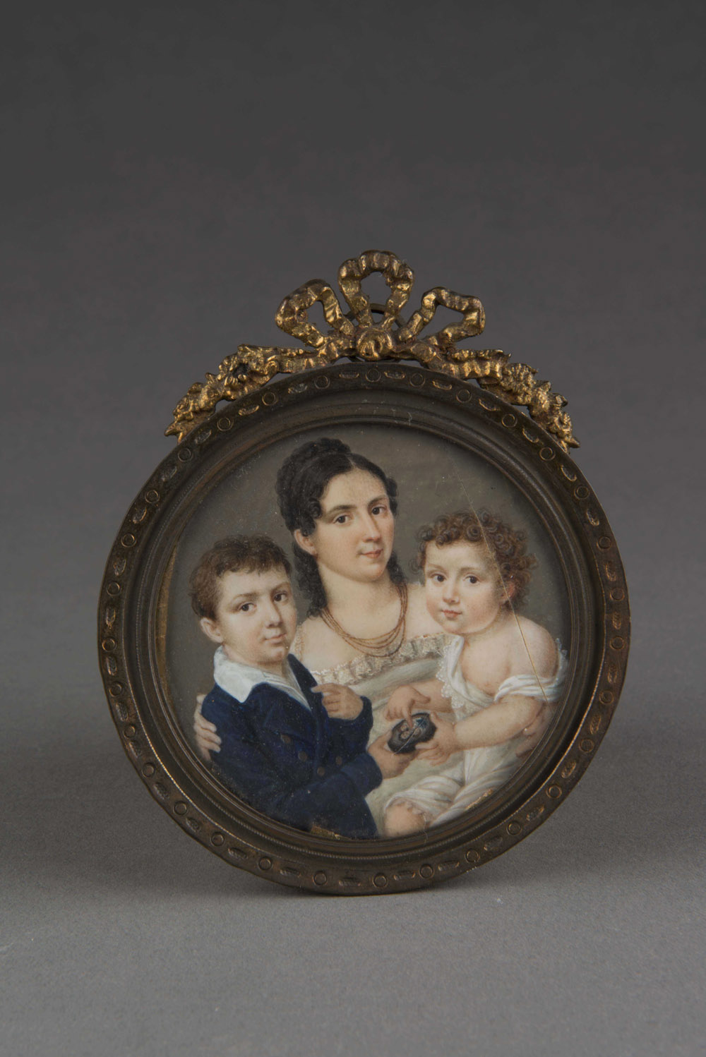 Maestro del sec. XIX "Ritratto di famiglia", miniatura tonda su avorio (diam. cm 8) In cornice dorata con cimasa a fiocco (difetti) 19th-century master "Family portrait" round miniature on ivory. Framed (defects)