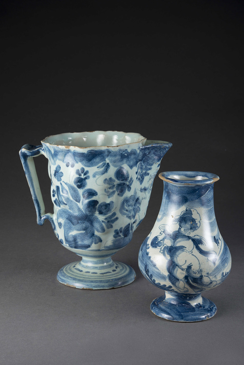 Lotto composto da un versatoio ‘ad elmo’ costolato con decoro naturalistico in blu su smalto azzurro. Piede restaurato (h cm. 16) Unito ad un piccolo vaso globulare in maiolica (h cm 14) con decorazione in monocromia blu con putto in paesaggio. Marca di fabbrica. Liguria, XVIII secolo (difetti e sbeccature) Lot comprising an 18th-century "helm" jug and a small majolica vase (defects, chipped)