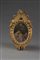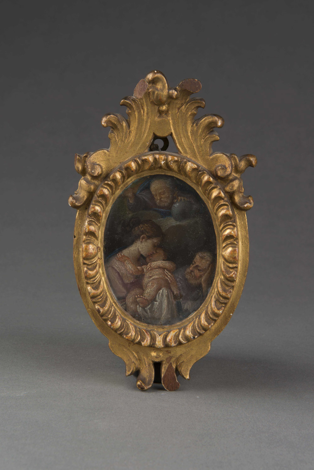 Scuola del sec. XVIII "Sacra Famiglia con Dio Padre" olio su rame (cm 13x7,5) in cornice dorata ed intagliata (mancanze) 18th-century school "Holy family with God Father" oil on copper. Framed (missing parts)