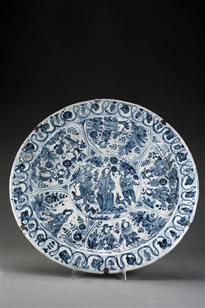Grande piatto tondo con decorazione calligrafica in monocromia blu. Al centro medaglione e tre figure in abiti seicenteschi con leopardo al guinzaglio; entro cinque riserve, figure di uomini e donne in un paesaggio. Deruta, sec. XVII (diam cm 43) (restauri) Large 17th-century round platter with blue decoration (restorations)