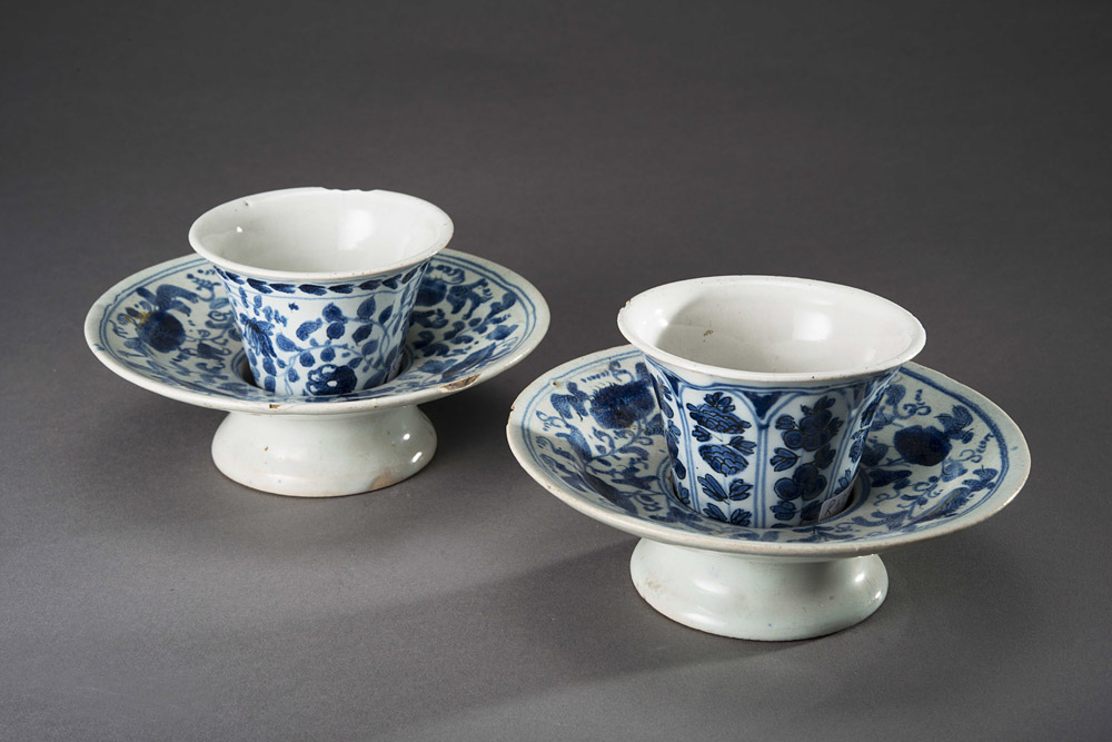 Coppia di tazzine a campana con piattino da caffè (trembleuse) in maiolica...