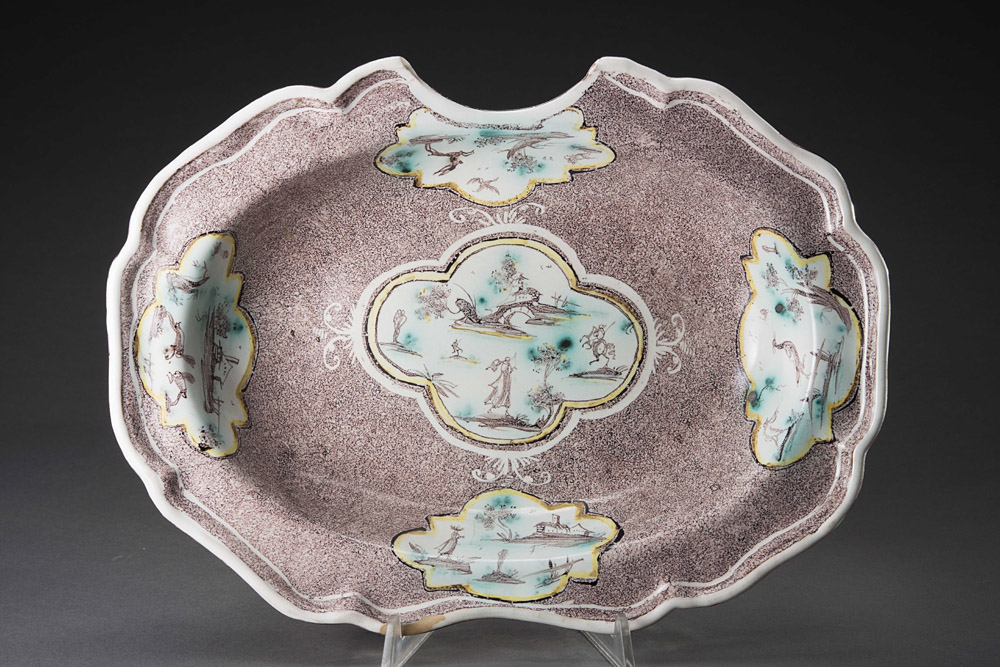 Bacile da barbiere in maiolica di forma ovale e bordo mistilineo con decorazione a marmorino in marrone violaceo di manganese con riserve contenenti 'paesaggini' e 'figuretti' in bruno e verde. Sul retro marca di fabbrica Globo crucifero e 'A.L.'. Savona, manifattura di Angelo Levantino , sec. XVIII (cm 34x15x25) 19th-century oval majolica barber washbasin