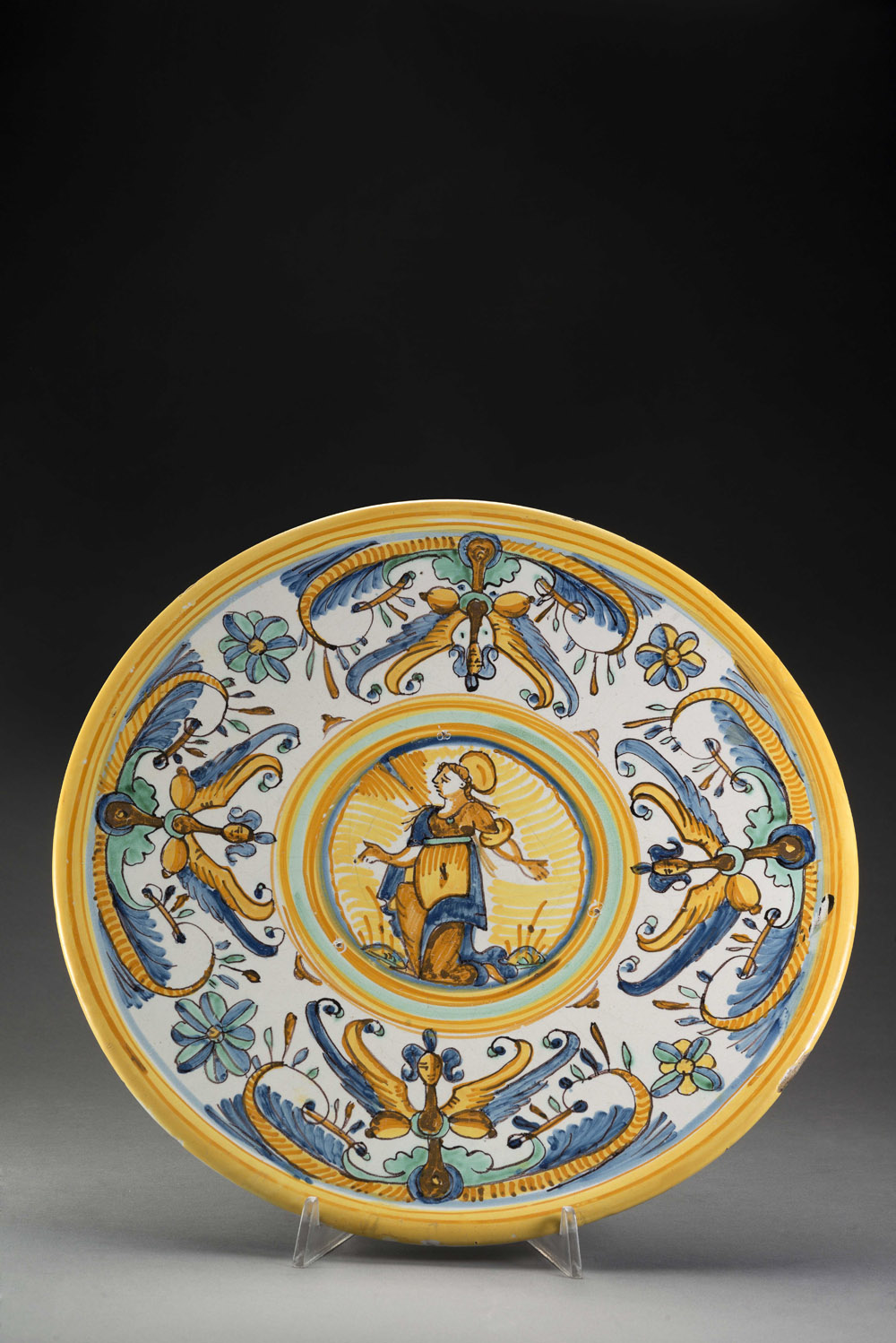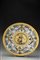 Tagliere in maiolica policroma decorato a raffaellesche con al centro un medaglione tondo raffigurante l’estasi di una santa. Deruta, sec. XVII (diam. cm 35) (restauri) 17th-century majolica chopping board (restorations)