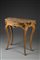 Tavolo da parete in legno intagliato e sagomato con piano in alabastro fiorito e fascia centrata da elemento decorativo.Gambe mosse sormontate da girali di foglie, piedi a ricciolo.Francia sec.XVIII(cm 85x88x43)(difetti) Carved wood side table with alabaster top. France, 18th century (defects)