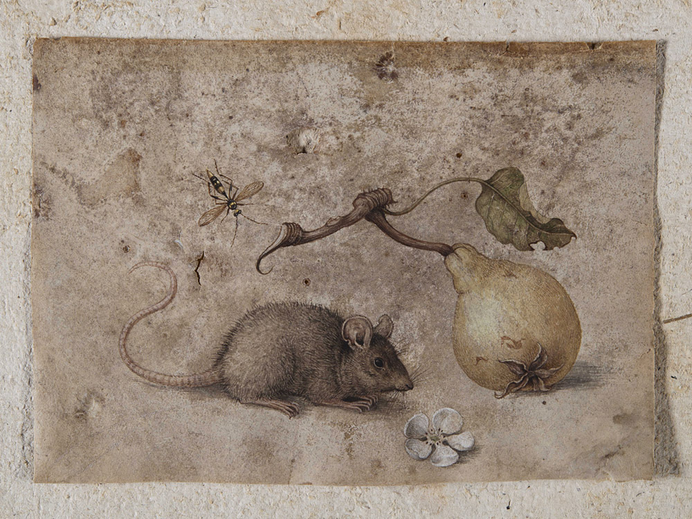 Maestro fiammingo del XVIII secolo "Topolino con pera" tempera su pergamena...
