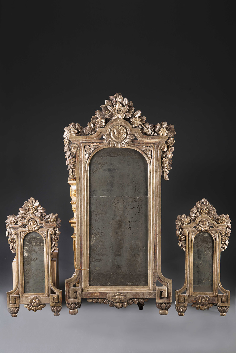 Trittico composto da una specchiera centrale e due piccole laterali in legno argentato ed intagliato a fiori, foglie e valve. Italia meridionale sec XVIII (specchio centrale cm147x72; specchi laterali cm76x37) 18th-century Italian tryptich comprising a central dressing table and two small side ones