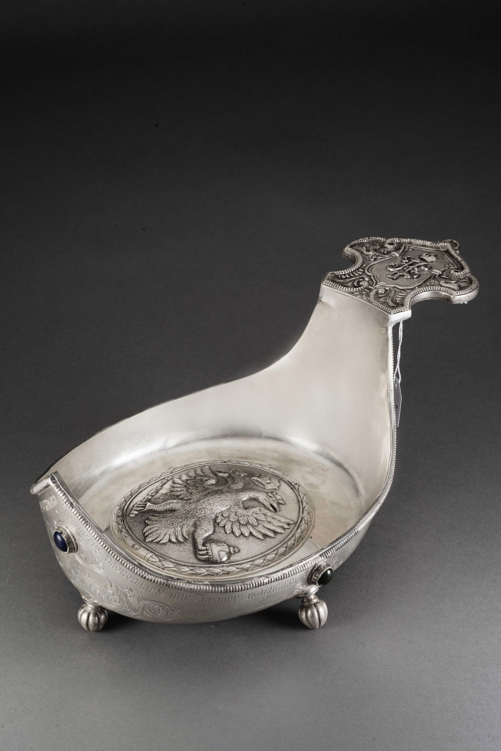 Kovsh in argento con presa decorata a volute fogliate e cifre coronate....