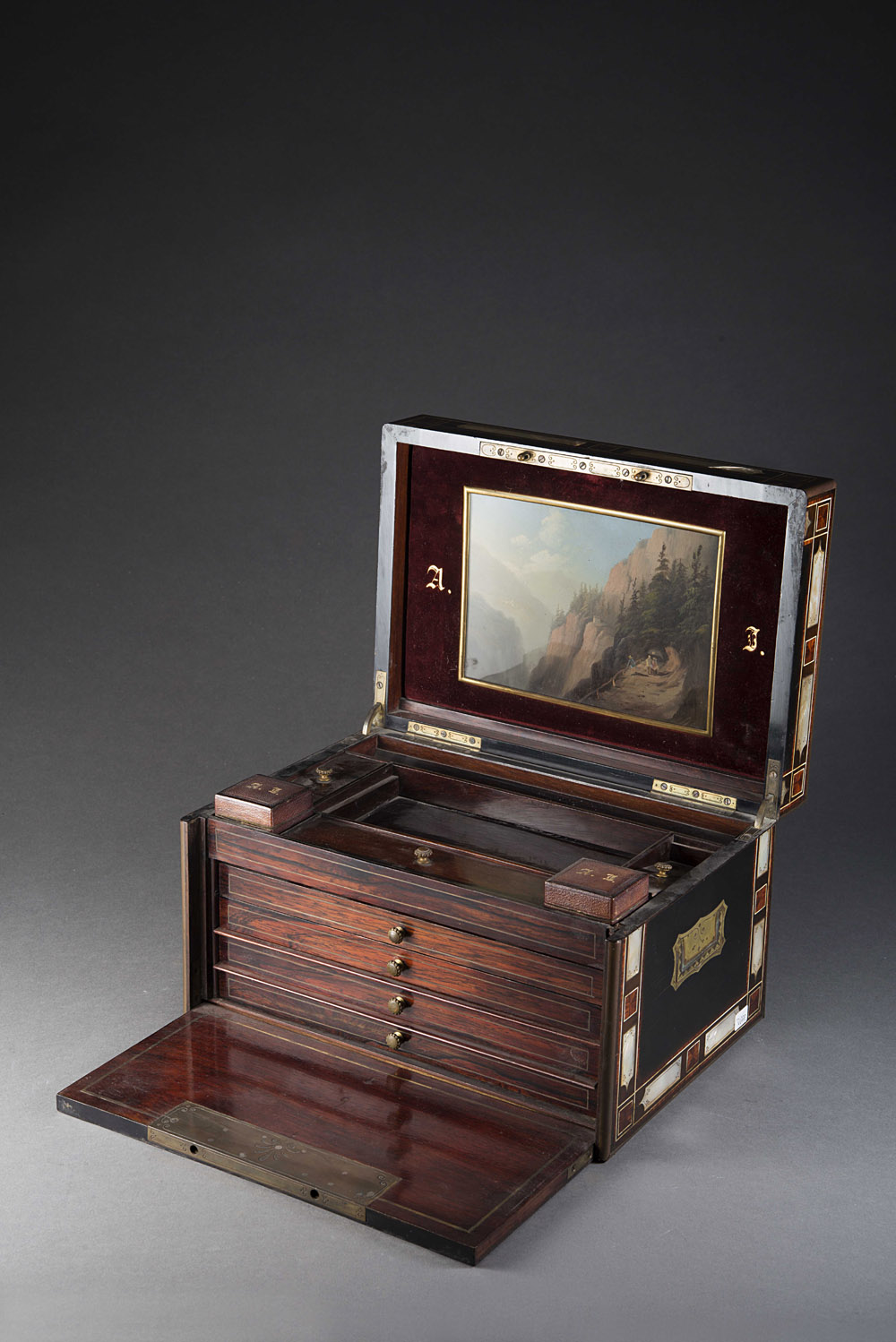 Scrittoio da viaggio in legno ebanizzato con profili intarsiati in madreperla, radica e ottone. Coperchio con dipinti ad olio raffiguranti paesaggio montano firmati da Ferdinand Sommer (Thun 1822-1901. Fronte e parte superiore apribili celanti calamaio, vani e cassettini. Portalettere in velluto cifrato A.I. e dipinto ad olio con scorcio alpino con figure. Sec. XIX (cm 27x17x19) 19th-century wooden travel writing desk with oil painted lid