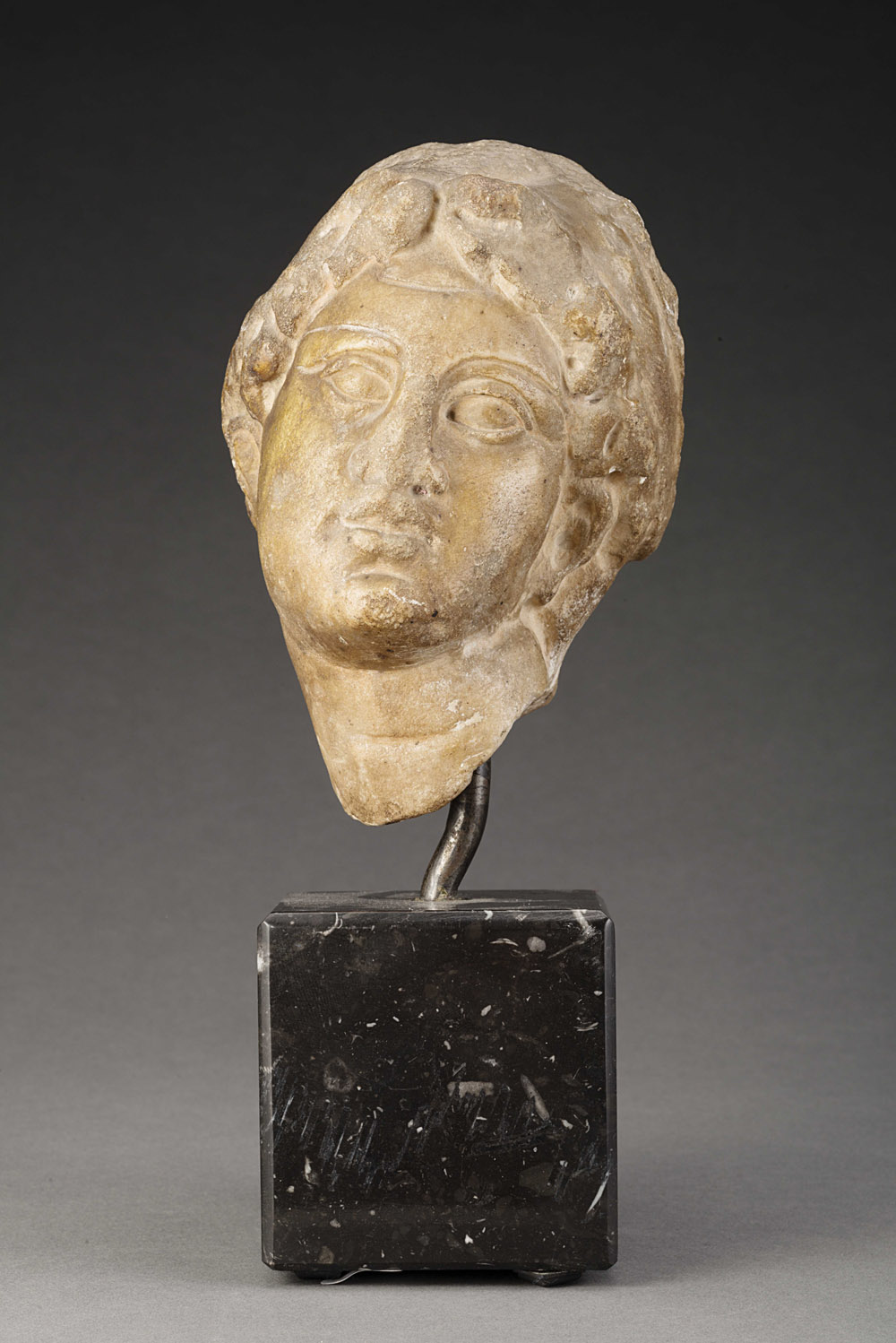 Arte della fine del sec XVI "Guerriero" testa in marmo (cm 13) poggiante su base a plinto (difetti) Late 16th-century art "Warrior" marble head (defects)