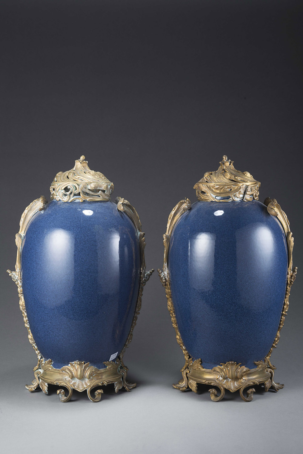 Coppia di vasi ovoidali monocromi in porcellana di colore blu intenso . Cina sec. XVII (difetti e restauri) Con montatura ormolu (h cm 51) Pair of ormolu mounted porcelain vases. China 18th century (defects and restorations)