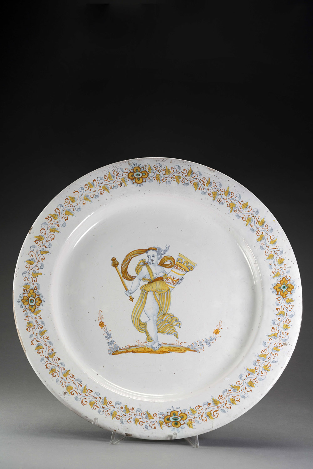 Grande piatto in maiolica compendiaria alla faentina su smalto bianco con ampio cavetto e tesa stretta da cui si dipana un decoro a ghirlanda vegetale a tralcio continuo con fiori stilizzati, interrotta da quattro borchie a fiore poste simmetricamente. Al centro allegoria della Fortezza. Deruta, 1580 circa (diam. cm. 41) Large Faenza-style majolica platter with an allegory of the Fortress