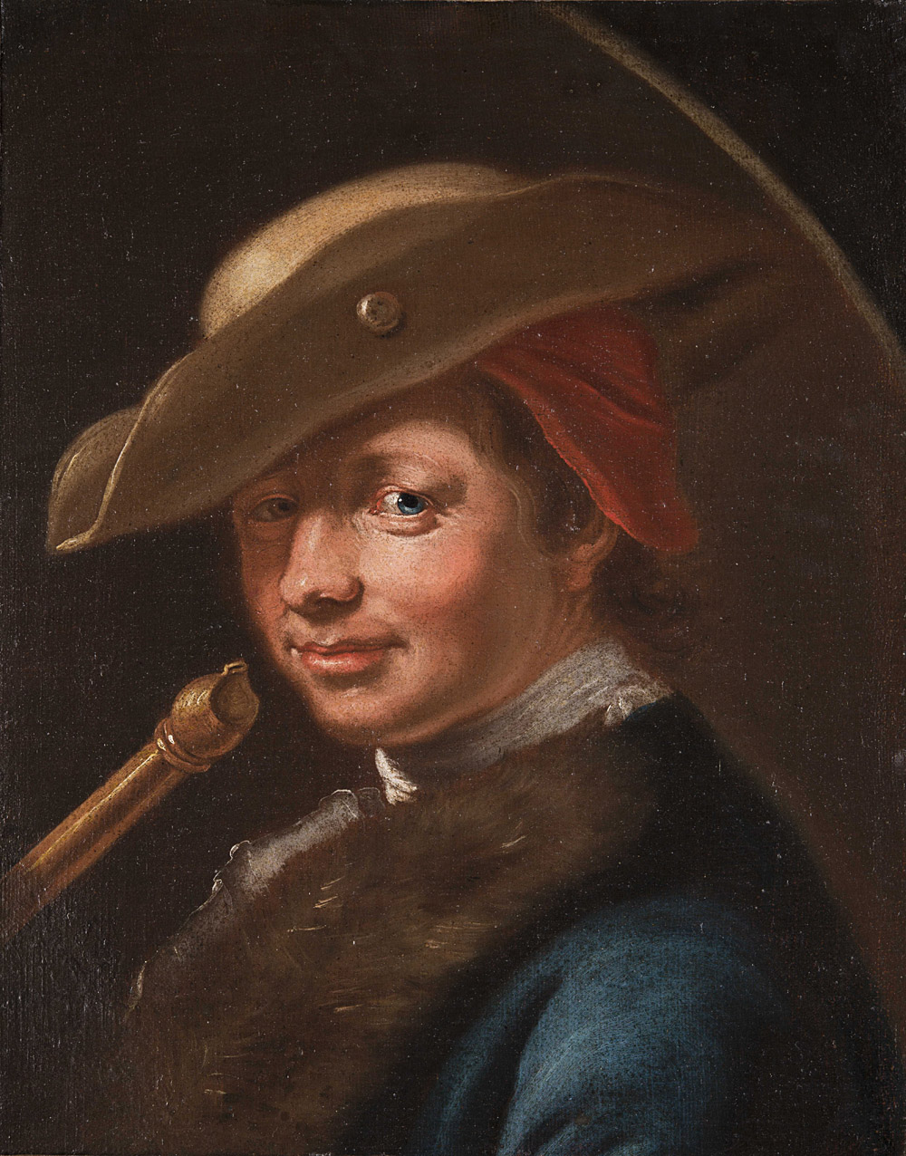 Maestro del sec. XVIII "Pastorello che suona il flauto" olio su tela (cm 55,5x43,5) 18th-century master "Young shepherd playing a flute" oil on canvas
