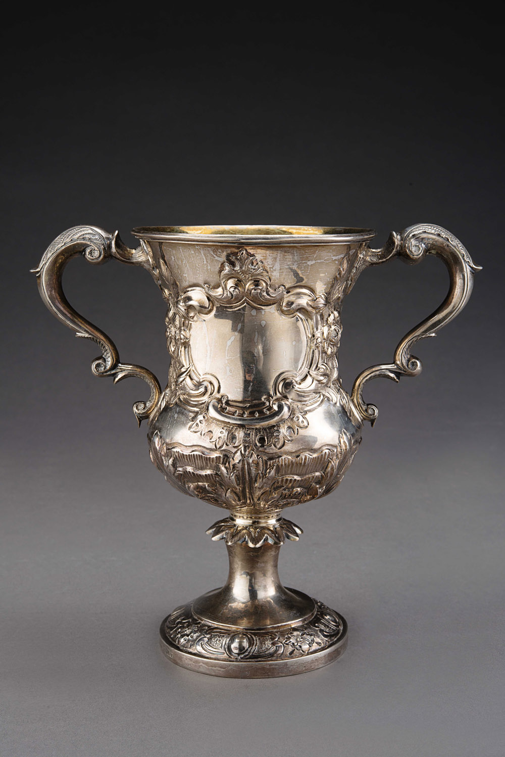 Coppa biansata in argento con corpo interamente sbalzato a volute con foglie e fiori, anse sagomate decorate a motivi vegetali, interno in vermeille. Argentiere M. West, Londra dal 1808 al 1824 (h cm 20)(gr 580) English silver cup