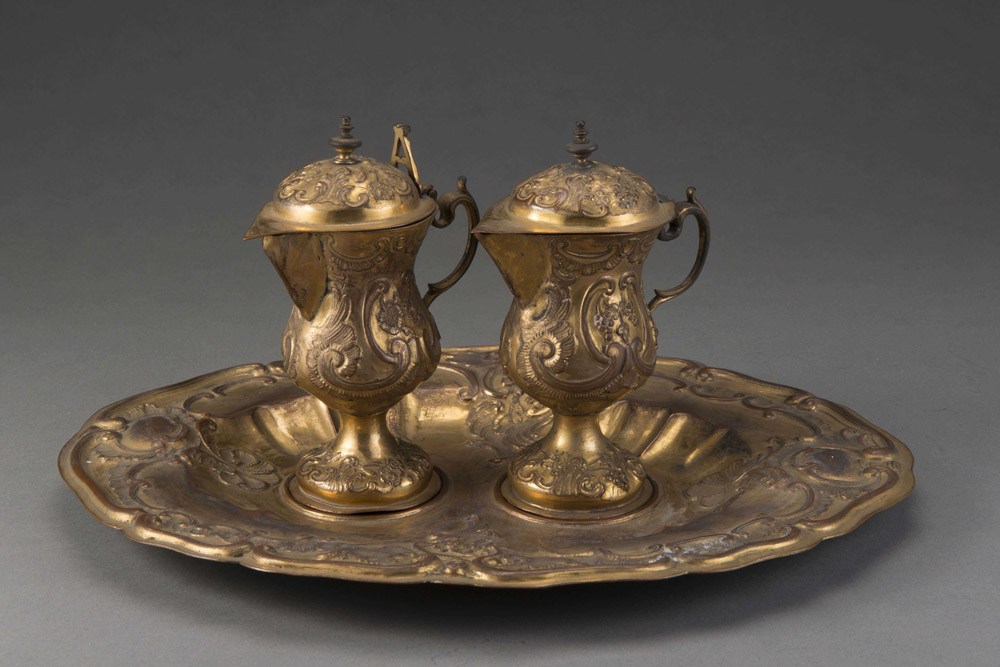 Ampolliera in rame dorato sbalzato a fiori e volute composta da vasoietto ovale e due versatoi. Sec XVIII (cm 31,5x15x25) (difetti) 18th-century jug stand (defects)