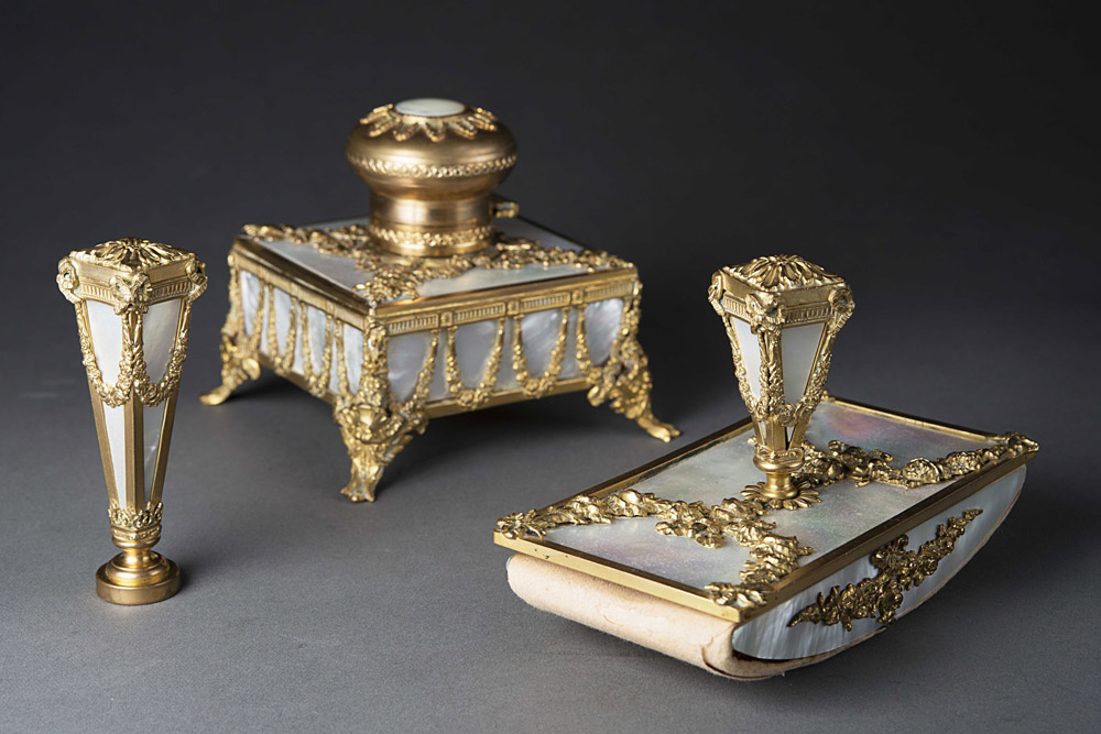 Set da scrivania composto da calamaio , timbro con cifre e tampone lastronato in madreperla e decorato in bronzo cesellato a motivi vegetali e fiocchi. Sec. XIX (lievi difetti) 19th-century writing set (minor defects)