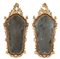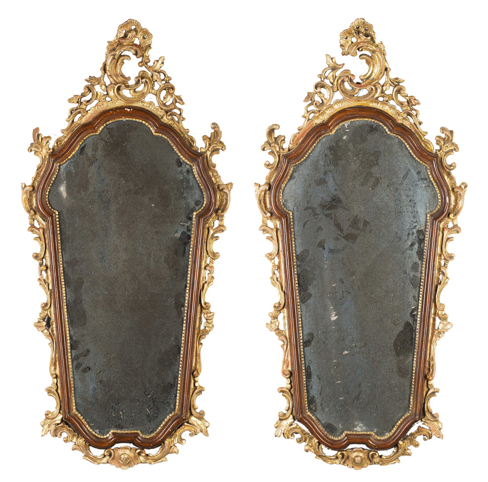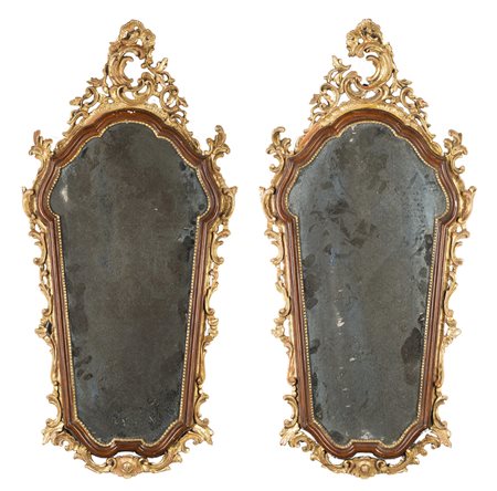 Coppia di specchiere di forma sagomata con cornice interna laccata a finto legno e decorata da perlinature. Cimasa a fregi intagliati, traforati e dorati a volute fogliate. Veneto, sec. XVIII (cm 80x38) (difetti) Pair of 18th-century Venetian shaped mirrors (defects)