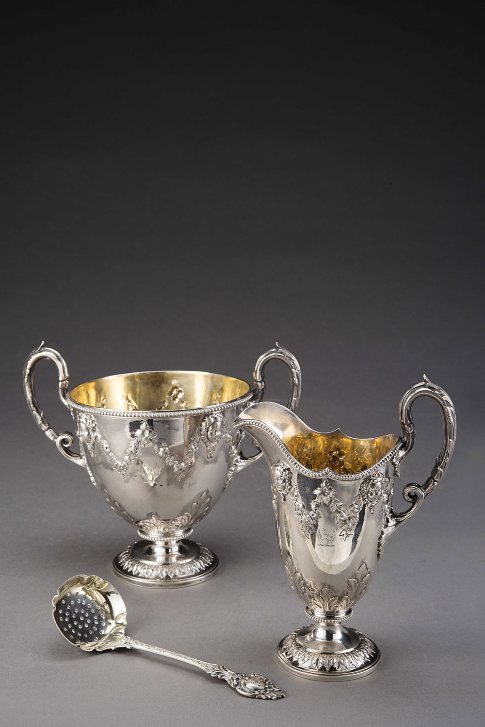 Parte di servizio da caffè composto da lattiera e zuccheriera in argento con corpi cesellati e sbalzati a palmette e volti femminili con ghirlande floreali, anse a volute fogliate, interni in vermeille. Argentieri Adward e John Barnard. Londra 1863 . Uniti ad un cucchiaino di diversa epoca (gr. 740) Part of coffee set