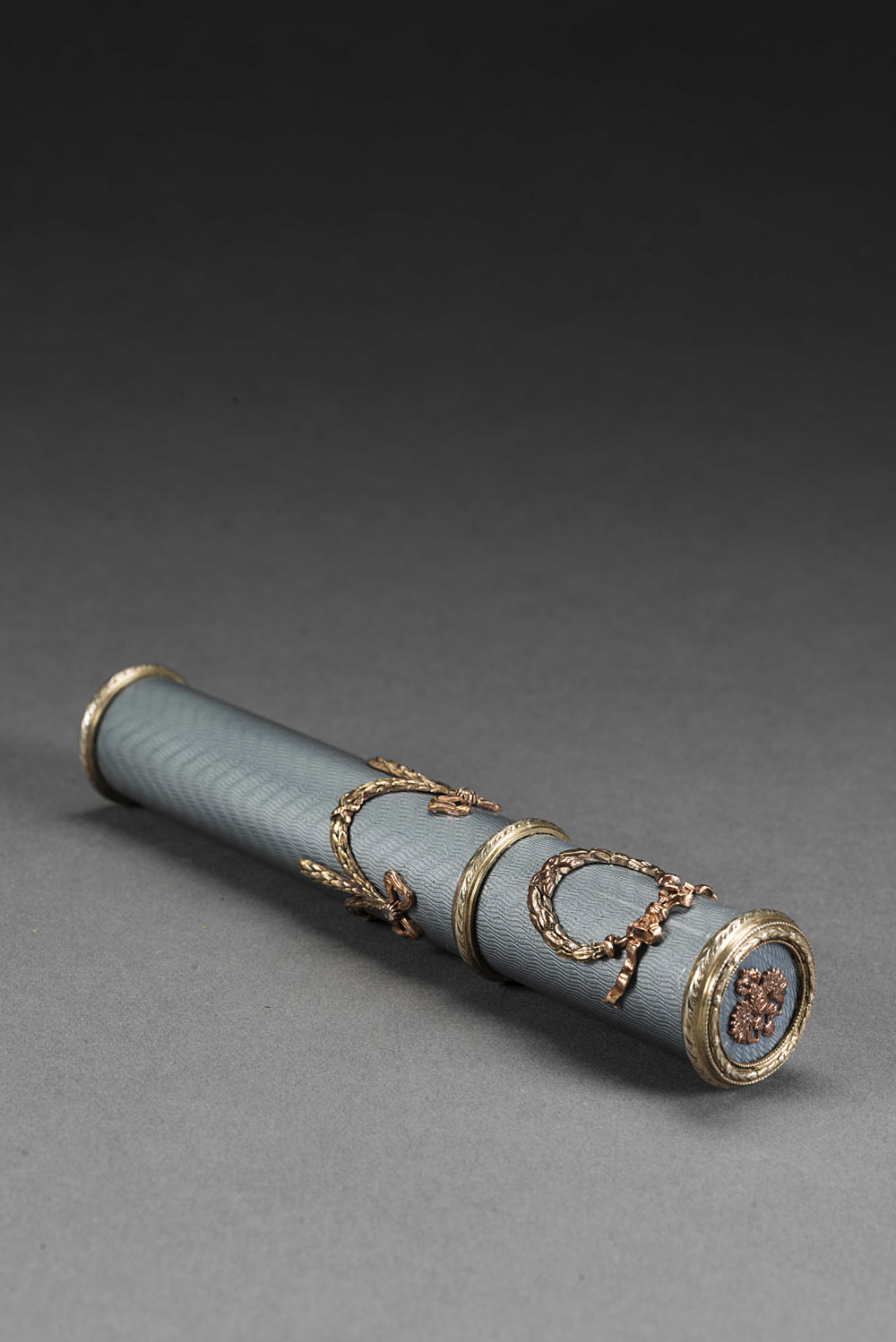 Astuccio per ceralacca in argento e oro con corpo in smalti grigi decorati da...