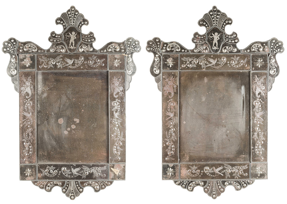 Coppia di specchiere di forma sagomata con specchi incisi a motivi vegetali e nella cimasa a amorini. Inizio sec. XIX (cm 90x74,5) Pair of early 19th-century dressing tables
