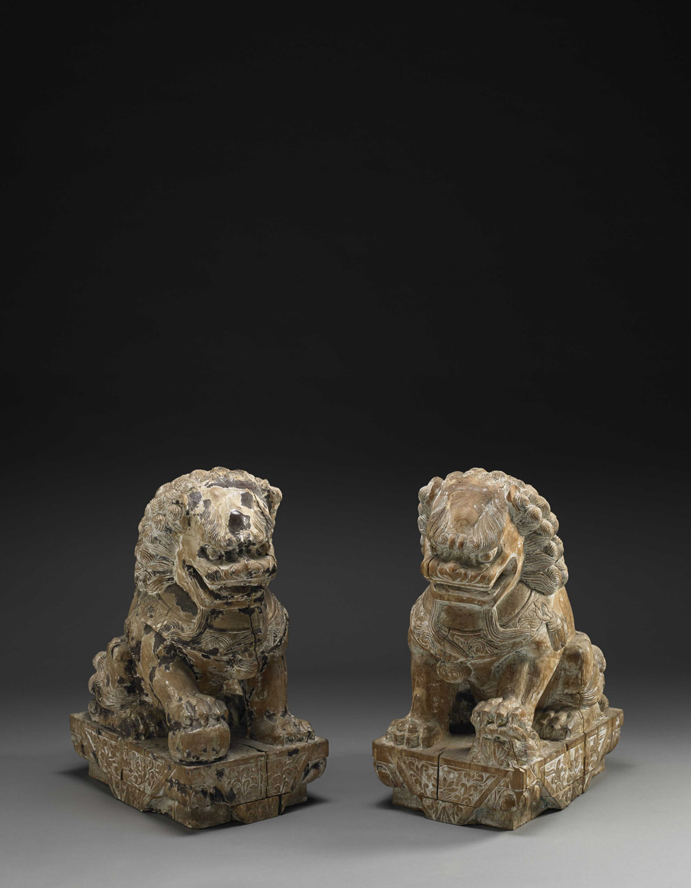 Coppia di grandi leoni Buddhisti in legno intagliato, ciascuno raffigurato seduto, con espressione feroce (usura e mancanze) Cina, sec. XX A large pair of carved wood Buddhist lions, each depicted seated, with ferocious expression (wear and losses) China, 20th century (h cm 75)