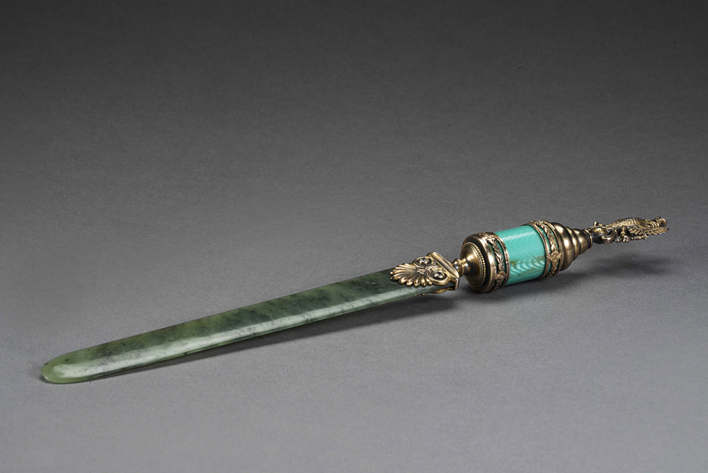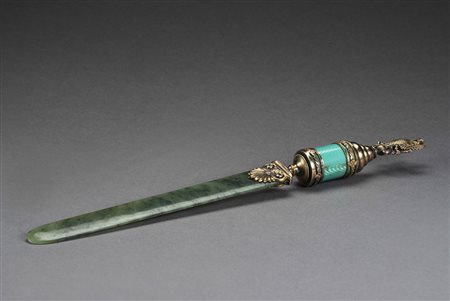 Tagliacarte con lama in nefrite e presa in argento dorato, cesellato a volute...
