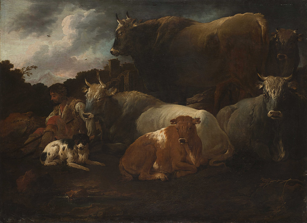 detto Rosa da Tivoli "Armenti" olio su tela (cm 98x134). In cornice antica "Herds" oil on canvas. Antique frame