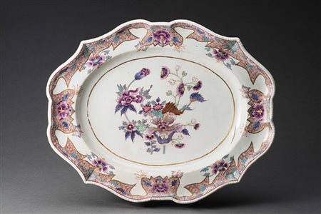 Piatto ovale in porcellana con bordo mosso e cordonato decorato in policromia a rami fioriti all’orientale al centro; sul bordo fiori in riserve con fondo a piccole spirali. Sul retro del bordo quattro cespi fioriti. Doccia, manifattura Ginori, 1750 circa (cm 31) (difetti di cottura) Il decoro di questo piatto viene chiamato ‘a fiori coreani’ e viene utilizzato a Doccia fin dall’inizio dell’attività della manifattura. Cfr. lotto n. 277 , 21 marzo 2005, "La Collezione Questa", Sotheby’s Milano. Oval porcelain dish (baking defects)