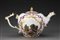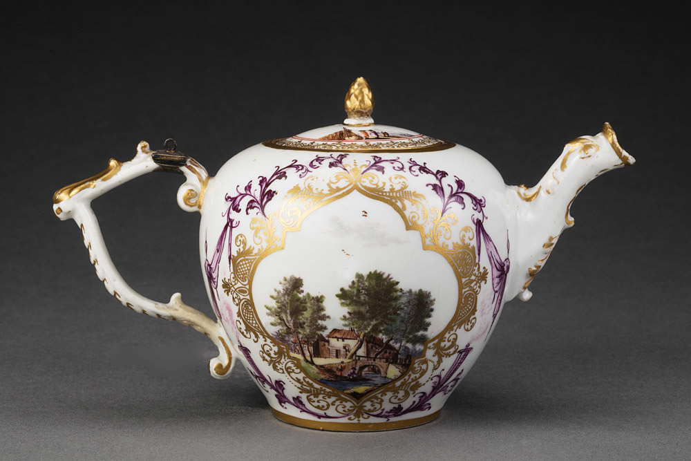 Teiera con coperchio in porcellana decorata in policromia con paesaggi entro riserve di girali e foglie. Pomolo a pigna, ansa con finali a ricciolo, beccuccio zoomorfo. Marca di fabbrica e numerale in oro. Meissen prima metà del sec. XVIII (cm 9) (difetti) First half of the 18th-century, Meissen. Teapot with porcelain lid (defects)