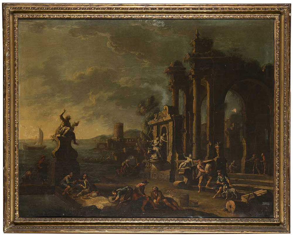 (Napoli tra il 1724 e il 1742) "Paesaggio con architetture" olio su tela (cm 101x128). In cornice (difetti) Prov. : Coll. Borboni (stemma al retro) "Landscape with architectures" oil on canvas (defects)