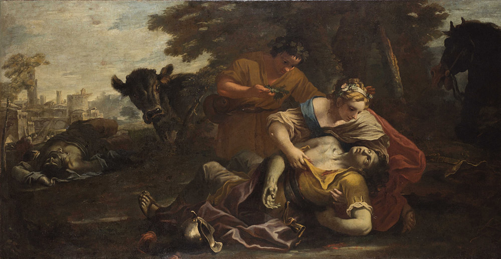 (attr.)"Angelica e Medoro" olio su tela (cm 150x295)In cornice in legno ebanizzato e dorato (difetti e restauri) "Angelica and Medoro" oil on canvas. Framed