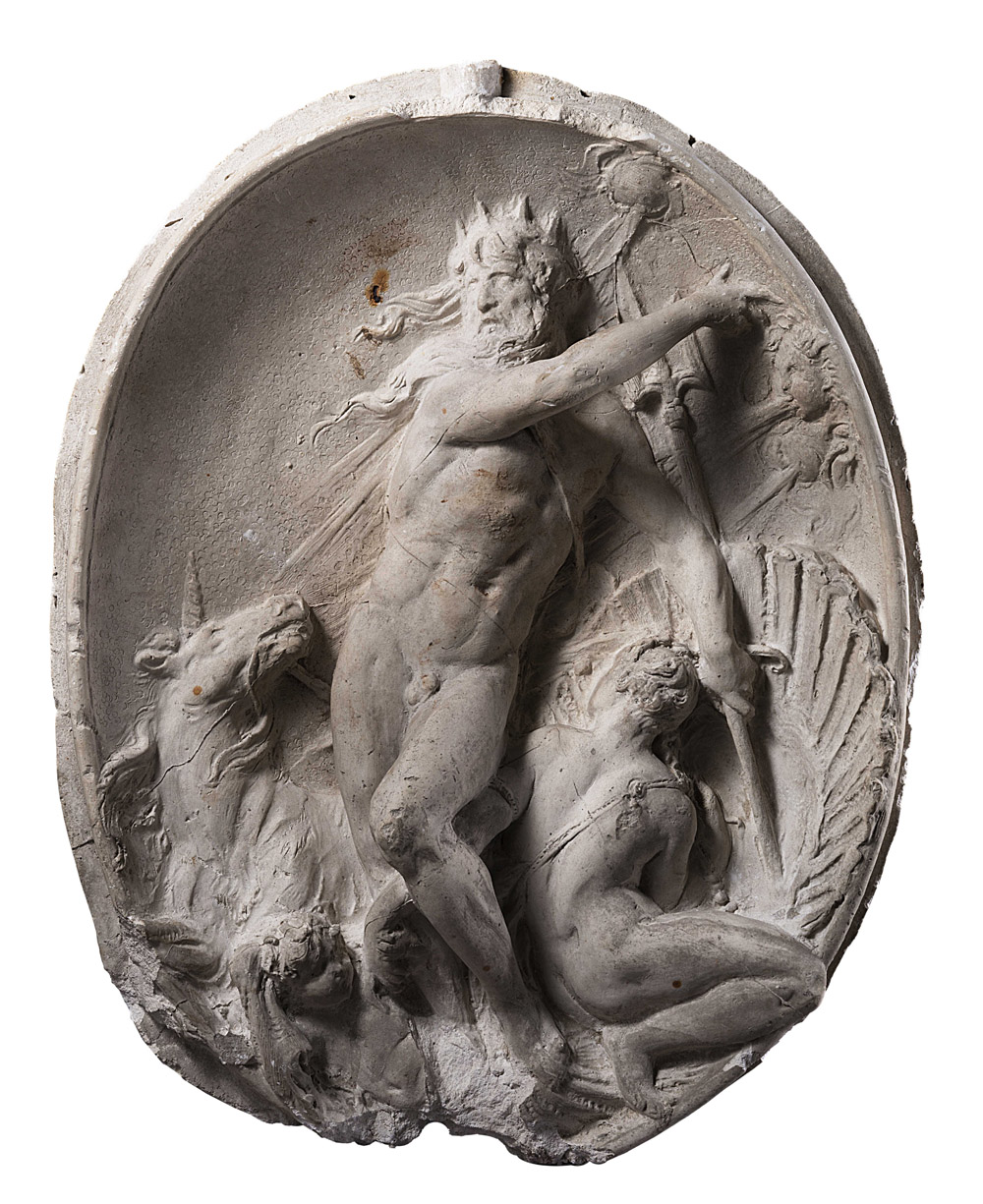 Bassorilievo a nicchia in gesso raffigurante Nettuno con ninfa, unicorno e...