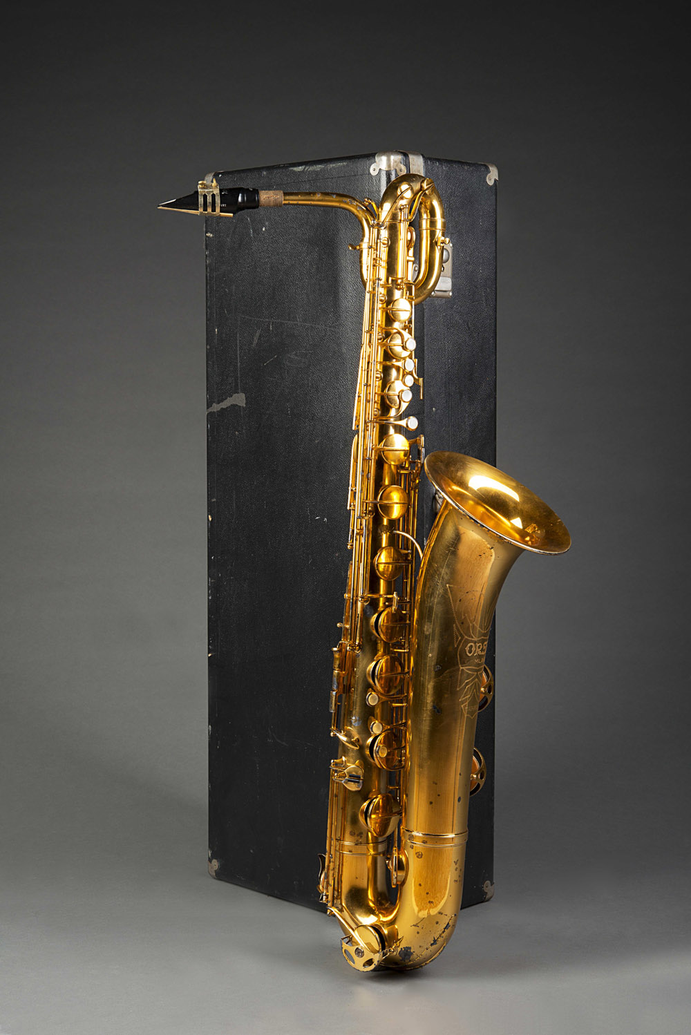 Sassofono baritono di Romeo Orsi, Milano anni'60: Modello Gabrio, in metallo dorato, in buone condizioni con qualche usura dovuta all'uso, marchiato "ORSI/ MILANO/GABRIO", con custodia Romeo Orsi, baritone saxophone