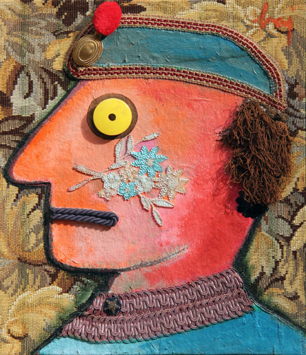 Enrico BAJ Milano 1924 - Vergiate 2003 Profilo di militare, 1973, tecnica mista su tela applicata su tavola, cm. 46 x 38, AA.VV. 'Catalogo Generale delle Opere di Enrico Baj dal 1972 al 1196', Coedizione Marconi-Menhir, Milano, La Spezia, 1997, p. 174, n° 1721, Firma 'Baj' (in alto a destra) Autentica dell'artista su fotografia