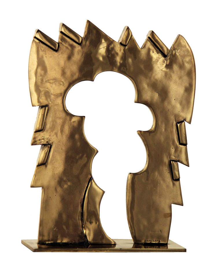 Pietro CONSAGRA Mazara del Vallo, 1920 - Milano, 2005 Porta di Giano, 1994, bronzo dorato, cm. 42.5 x 32.5 x 10, Edizione di 3 esemplari #La misura comprende la base #Numerazione '3/3' (in basso a sinistra); #firma 'Consagra' (in basso a destra) Autentica dell'artista su fotografia