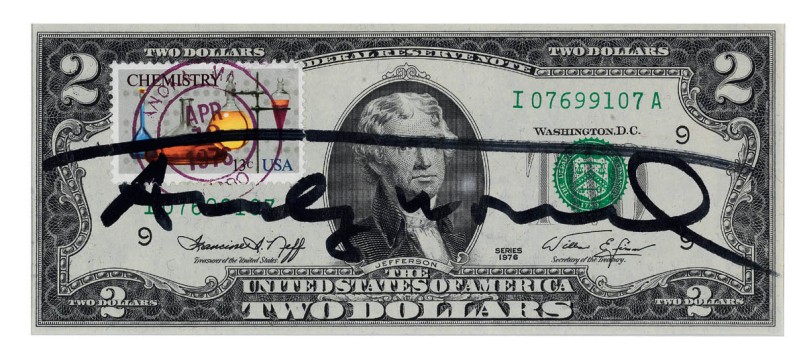 Andy Warhol Pittsburgh 1928 - New York 1987 Two dollars Jefferson, 1976 Tecnica mista su banconota, cm. 7x15,5 Firma al centro: Andy Warhol: timbro postale con data Apr. 1976; al verso: timbro Andy Warhol.