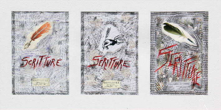 Gino GINI Milano, 1939 Scritture n.5 - Scritture n.4 - Una parola al giorno, 1996, collage e tecnica mista su tela, cm. 28.5 x 20.5, Trittico #La misura è riferita ad ogni singola opera #Firma, data 'Gino Gini, 96' (in basso al centro di ogni opera) #Etichetta e timbro dell'artista; #etichetta del Museo della Carale, Ivrea, 2014; #etichetta della mostra 12 settembre-11 ottobre 2014 presso Quadrige, Nizza (al retro) Autentica dell'artista su fotografia