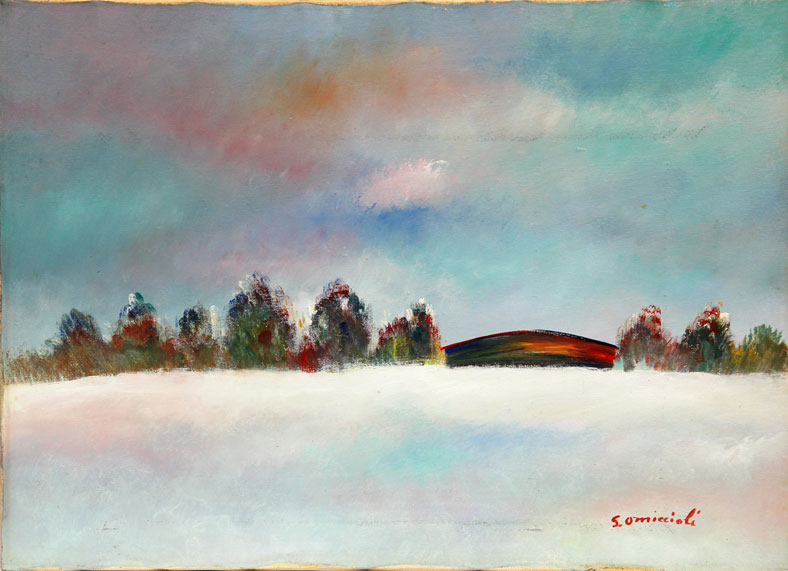 Giovanni OMICCIOLI Roma 1901 - Roma 1975 Senza titolo, olio su tela, cm. 50 x 70, Firma 'G. Omiccioli' (in basso a destra) #Firma 'Dipinto e firmato di mia mano G. Omiccioli', #dedica (al retro) Autentica dell'Archivio Opere G. Omiccioli, con n° 000122009
