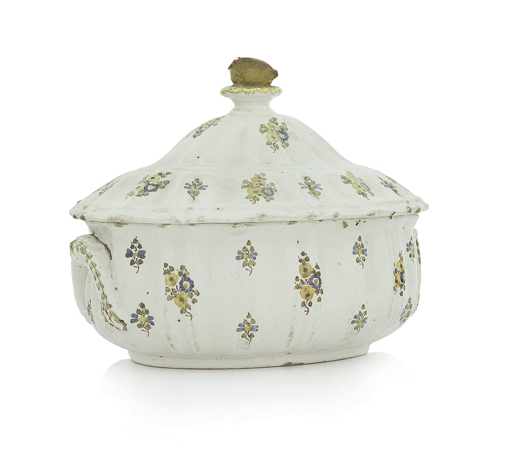 Lotto 32 | CERAMICA ZUPPIERA CON COPERCHIO IN MAIOLICA, XVIII SECOLO, decoro policromo a...