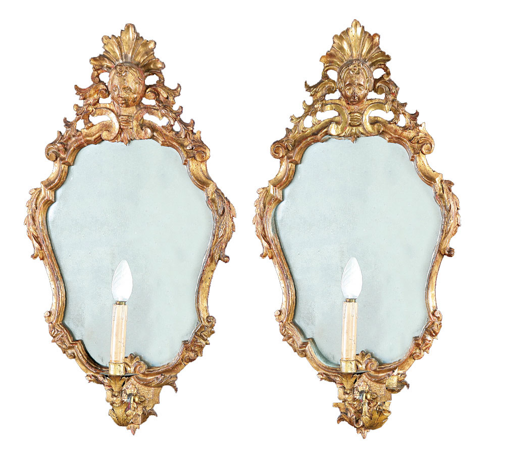 COPPIA DI SPECCHIERE AD APPLIQUE IN LEGNO SCOLPITO E DORATO, XVIII SECOLO, cornici sagomate con cimase a volute centrate da volti muliebri, bracci portacandela in lamierino; sbeccature e usure.