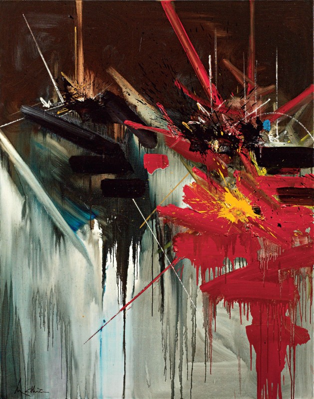 Georges Mathieu Boulogne-sur-mer 1921 Délire amer, 1990 Olio su tela, cm. 145x114 Firma in basso a sinistra: Mathieu; titolo al verso sul telaio: Délire amer: timbro Galerie Protee, Paris; sulla tela: etichetta con n. 8605 e timbro Galleria Arte Centro, Milano. Storia: Galerie Protee, Parigi; Galleria Arte Centro, Milano; Collezione privata Esposizioni: Georges Mathieu, Milano, Galleria Arte 92, 4 aprile - 13 luglio 1991, cat. pp. 24, 25, n. 3, illustrato a colori. Bibliografia: G. Xuriguera, P. Grainville, Georges Mathieu, Nouvelles Editiones Françaises Editeur, Parigi, 1993, p. 199, n. 314.