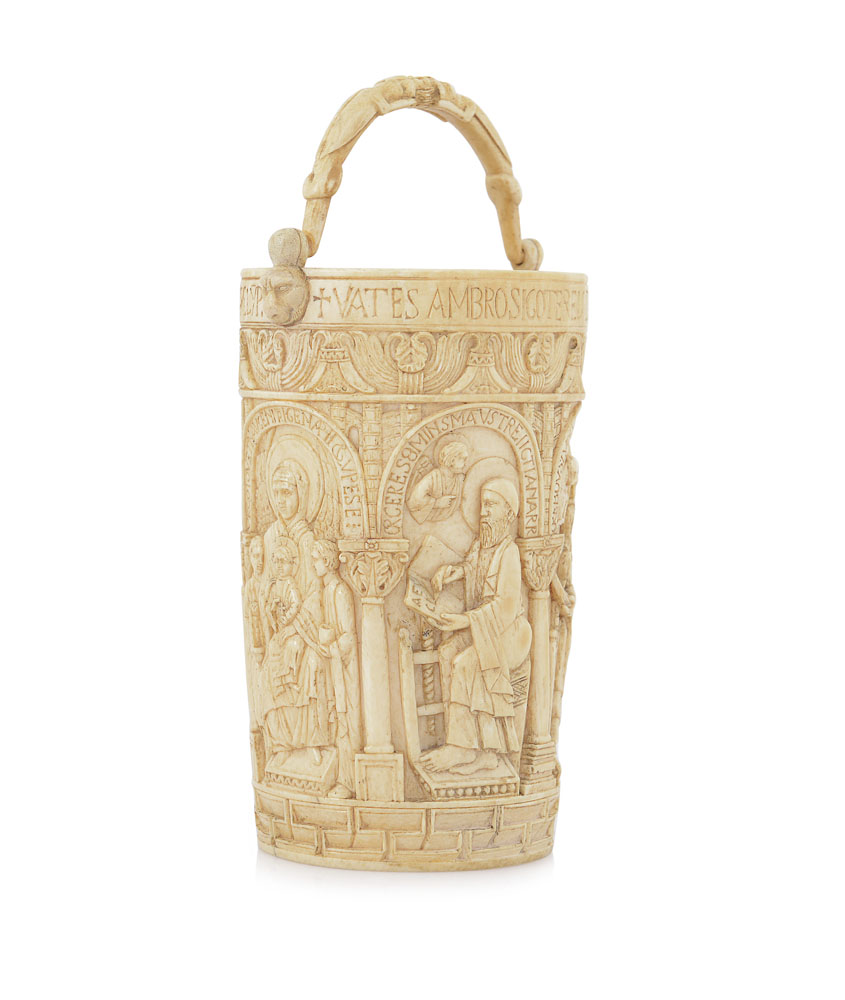 VASO IN AVORIO SCOLPITO, MODELLO DELLA SITULA DEL VESCOVO GOTOFREDO ARCIVESCOVO DI MILANO, XIX SECOLO, troncoconico rastremato con manico basculante, decoro a rilievo a tutto corpo con Madonna con Bambino e i quattro evangelisti entro nicchie cimate da fregi a foglie d'acanto e iscrizioni latine; lievi usure.