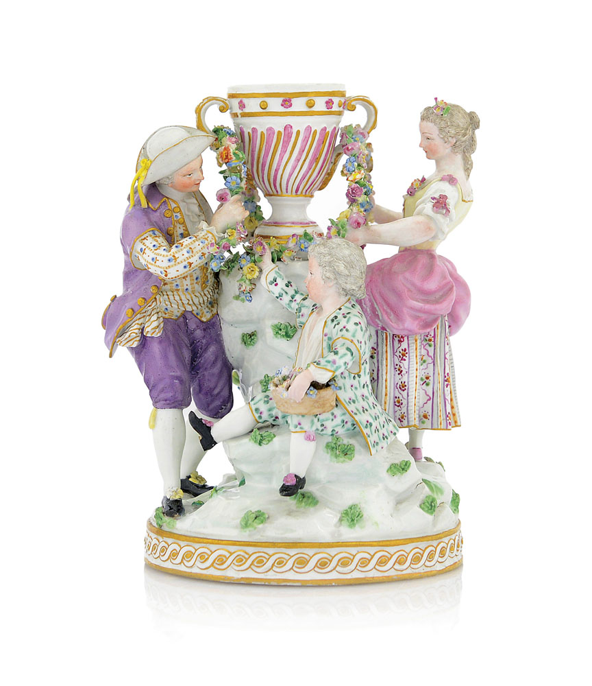 GRUPPO IN PORCELLANA, MEISSEN, 1770 CA., raffigurante giovane coppia con bambino e ghirlande di fiori su base a roccia cimata da vaso, decoro policromo e in oro.